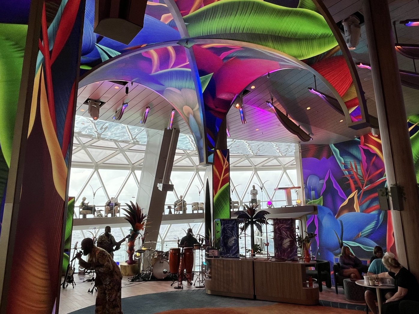 Right after mixology, we went back to the Bazaar hoping to nab a spot to watch the Carnival show. And though we’d arrived an hour before the 4:30 PM showtime, there was not a seat to be had anywhere, including where you most definitely cannot see the show. A side effect of looking for a seat was that we got some steps, doing the full walking tour of every possible spot on deck 5, along the giant aft windows, and overlooking the Bazaar from deck 6.