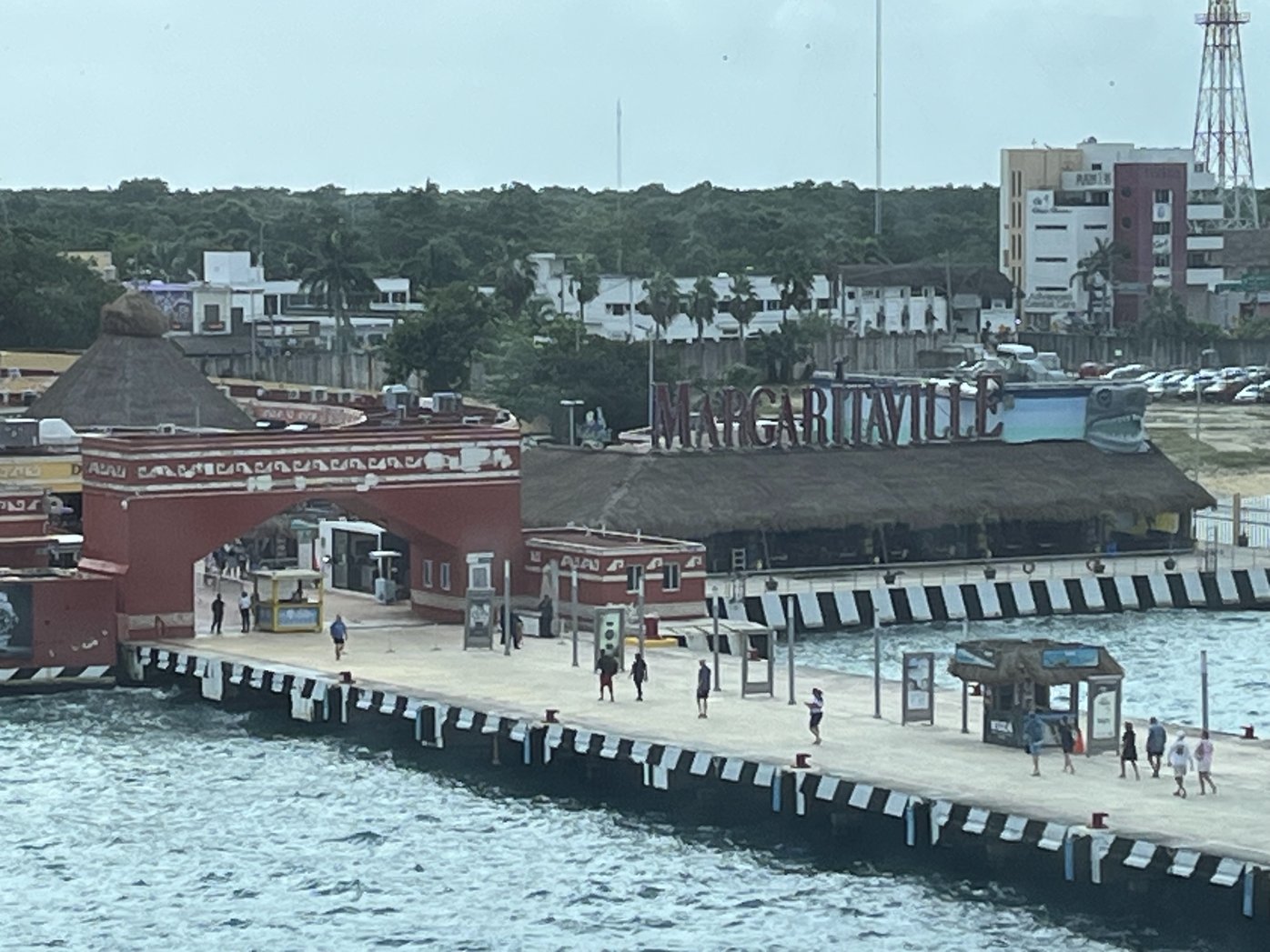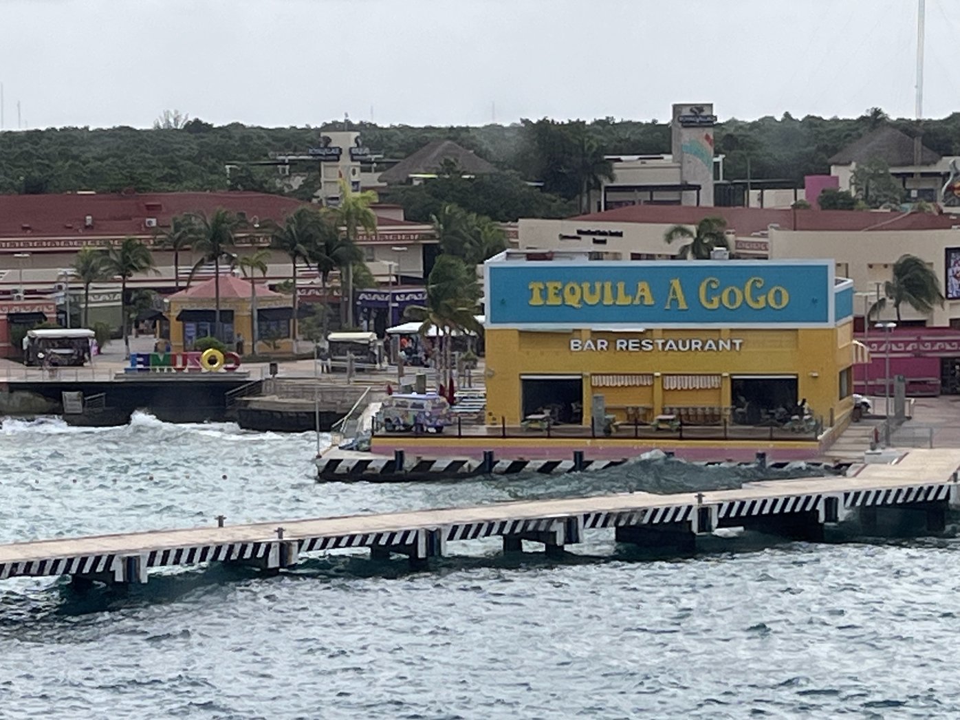 There was still time before we needed to check in for the excursion, so we wandered around the cruise terminal for a while. You walk around outside, and step inside to the various stores, and in our case we popped into one of the Pharmacias to pick up a hair tie for Rona, in order to resist the wind. All the stores seemed to take US dollars. There’s a big duty free shop, random other shops, as well as a Señor Frogs, Tequila a GoGo, and Margaritaville.
