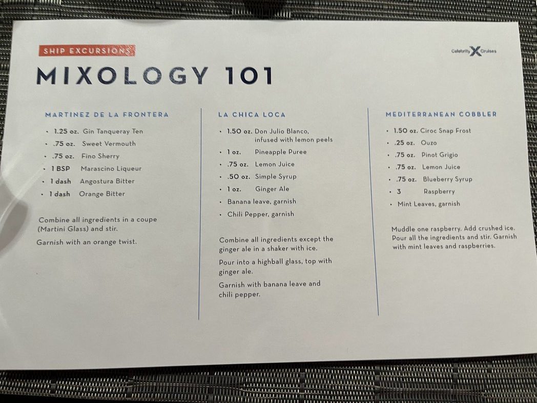 After a short digestion break, it was time for our Mixology 101 ship excursion back at the World Class Bar, and it was led by the same bartender from the evening before. We were a small group seated at the bar, set up with all the tools of the trade. You learn about the different preparations from stirring to shaking and then create three different cocktail, with the mixologist demonstrating each first.