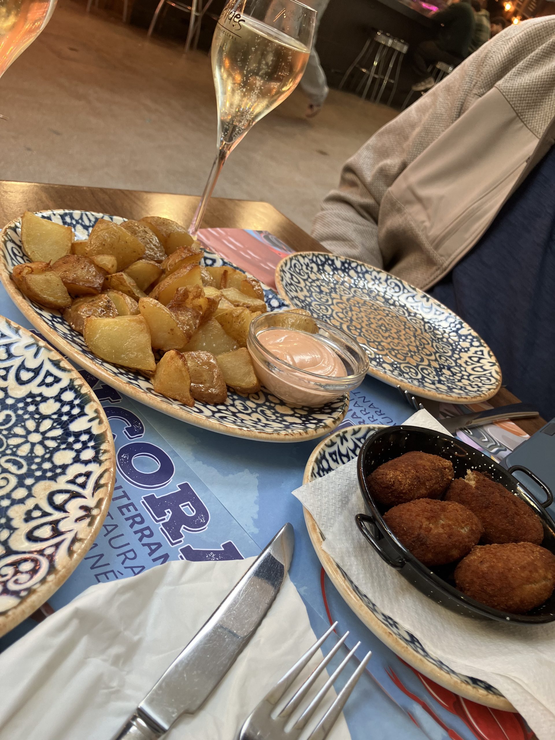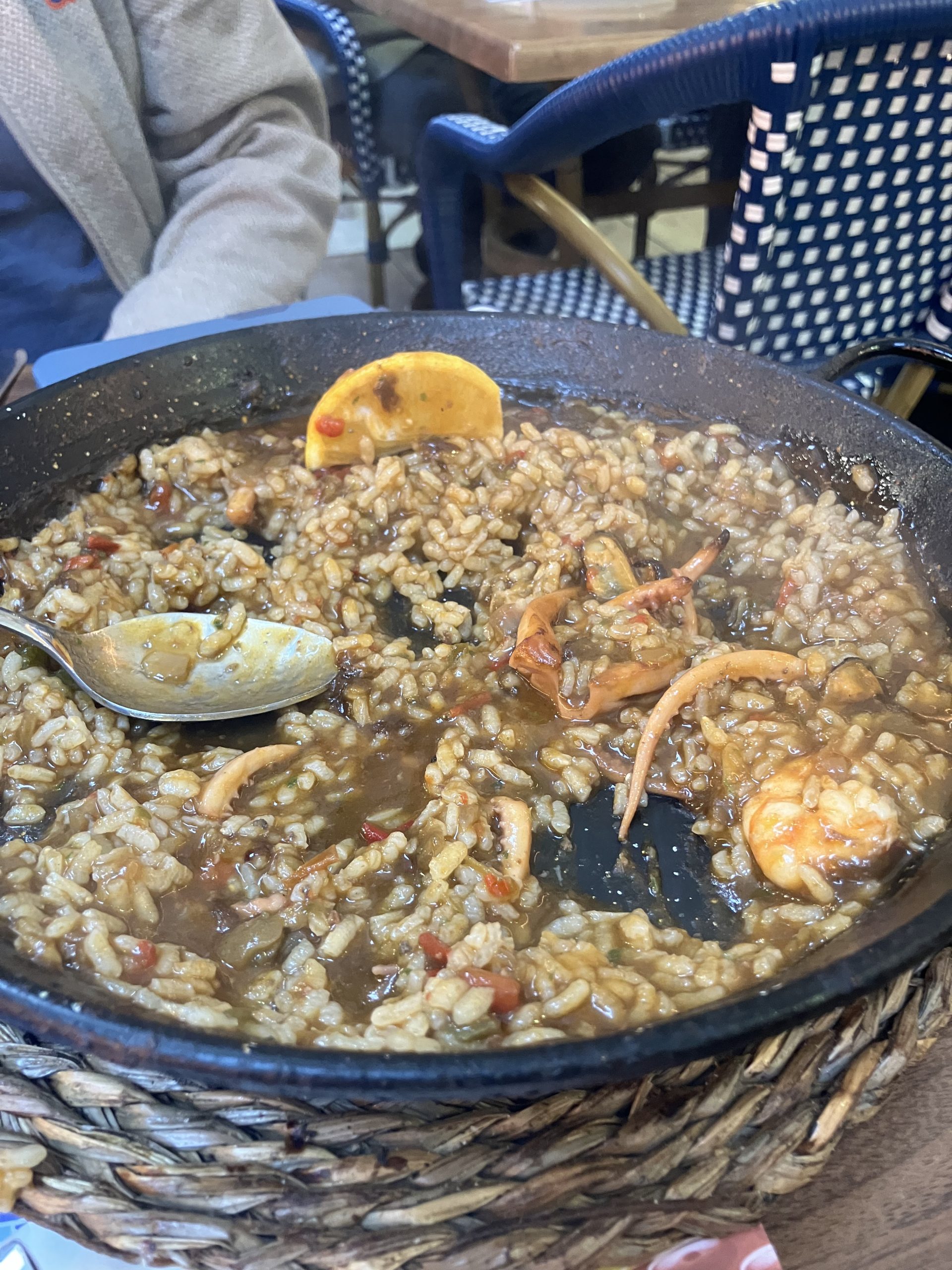 After much wandering, it was time for some hopefully authentic Catalonian paella, so headed back toward La Boqueria to a restaurant we had seen earlier called Ancora. By the look of it, this was a place the vlogger Spanian had checked out on one of his It’s All Eats episodes. Let’s OGG! There was Cava, a sparkling Spanish wine, croquetas, Patatas Bravas, and seafood paella. The croquetas were okay and the Patatas Bravas were just fine. The next night we would have much better, at a different restaurant. The paella, however, was great. With drinks, this set us back $60, including a small gratuity.